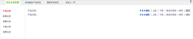 管理網站欄目分類,點擊左則可以選擇欄目,在右則可以對所屬的欄目(SEO編輯(詳細【3.4.1】章節進行介紹)、上下移動、添加子類別,修改,刪除)。
