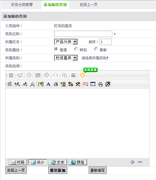 1.在“父類指向”字段,顯示欄目父類。2.在“類別名稱”字段,欄目類別名稱。3.在“所屬欄目”字段,設置新建的分類所屬欄目。4.在“類別屬性”字段,設置分類普通、特別、最新展示方式。5.在“所屬類別”字段,設置新建分類所屬父分類。6.在“類別說明”字段,填寫分類簡介信息。