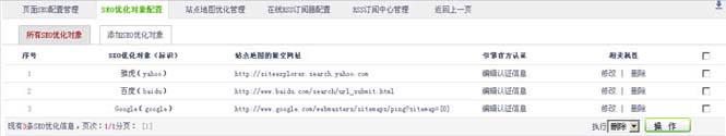 對SEO優化對象進行,添加、對站點地圖的提交網址、引擎官方認證信息修改與刪除操作,以便在3.4.3章節中配置的網站地址提交至搜索引擎。