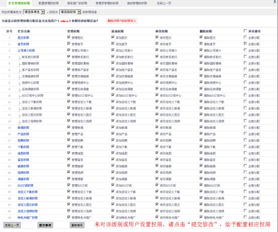 管理網站用戶對網站的操作權限,權限設置分為:欄目管理的權限、 配置管理的權限、商務推廣的權限、管理員管理的權限、高級管理的權限。
